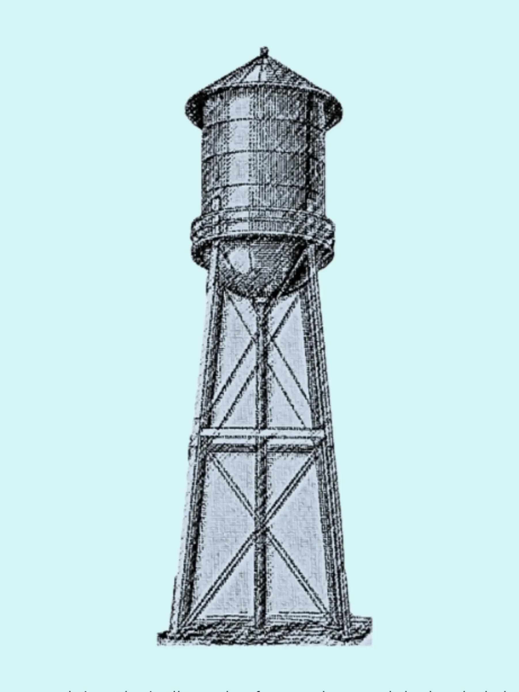 A large container, typically made of concrete or metal, elevated above ground level to store water and distribute it to a surrounding area. By storing water at this height, gravity does the work of pushing water through pipes to homes and buildings without needing pumping at every distribution point.