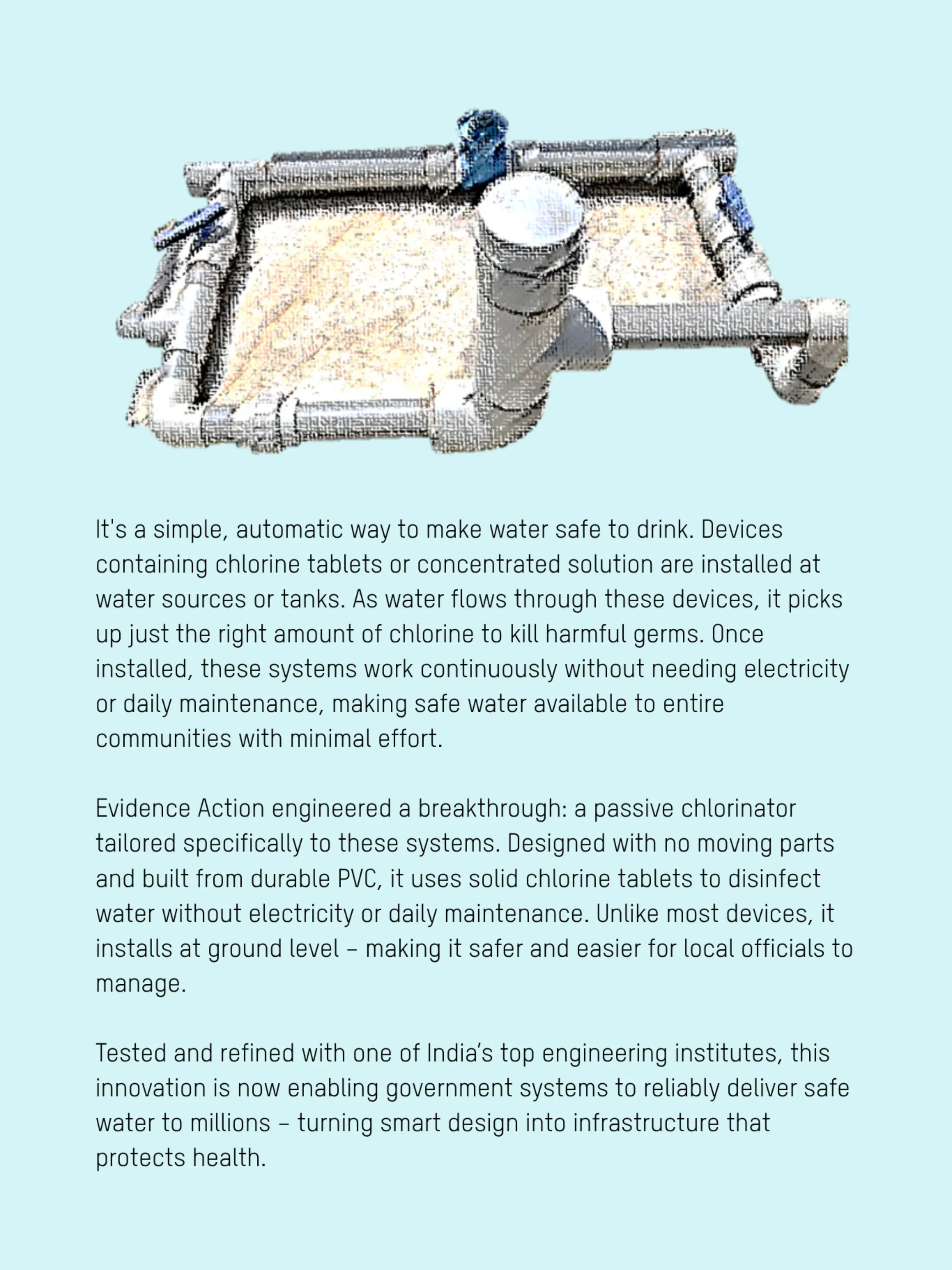 In Andhra Pradesh, with support from the state government and Evidence Action, tablet based in-line chlorination devices were installed in 2024, with additional installations planned for 2025. These low-cost systems automatically dose chlorine into water as it flows through village pipelines.